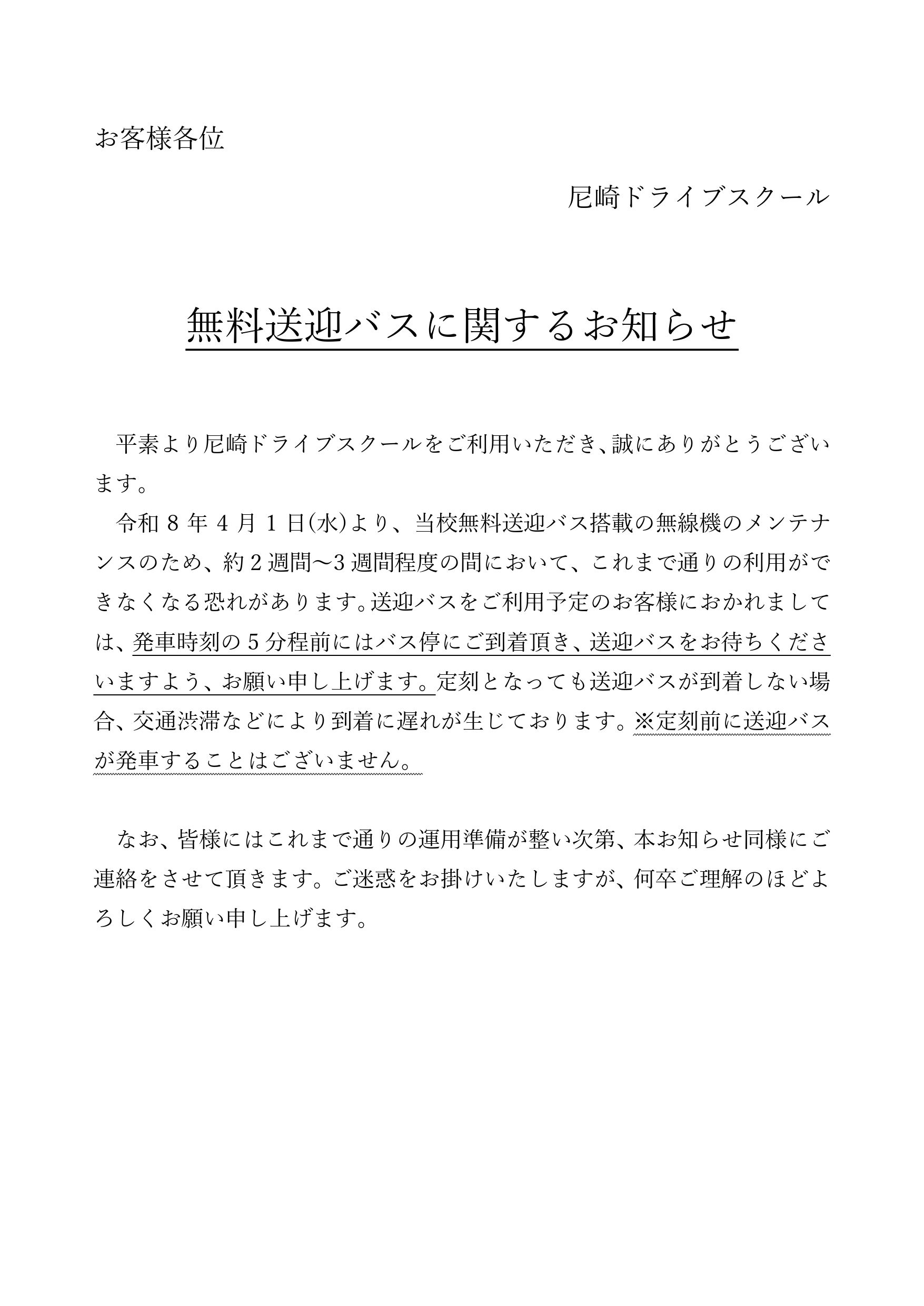 HOME > お知らせ > 当校の無料送迎バスに関するお知らせ